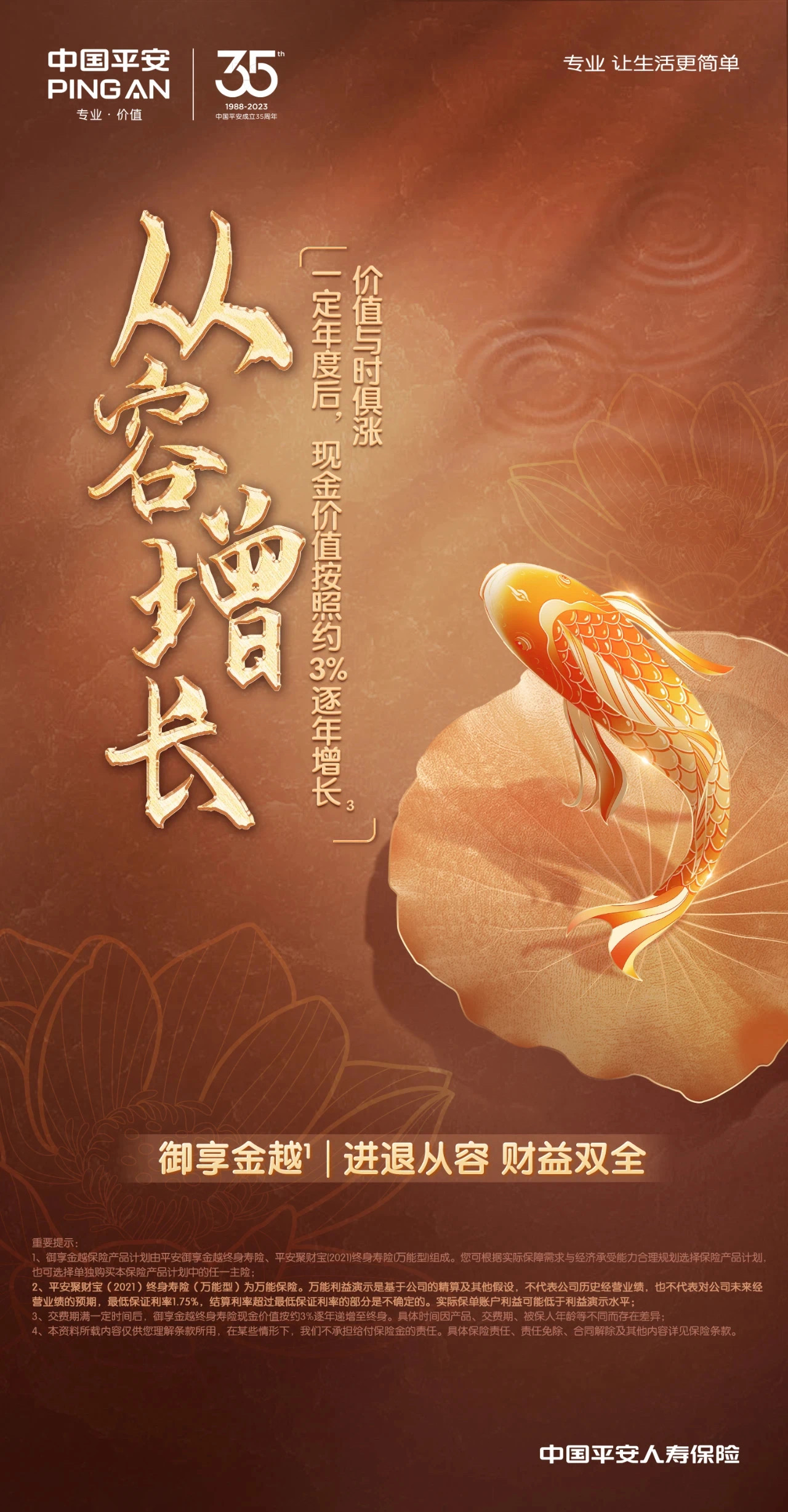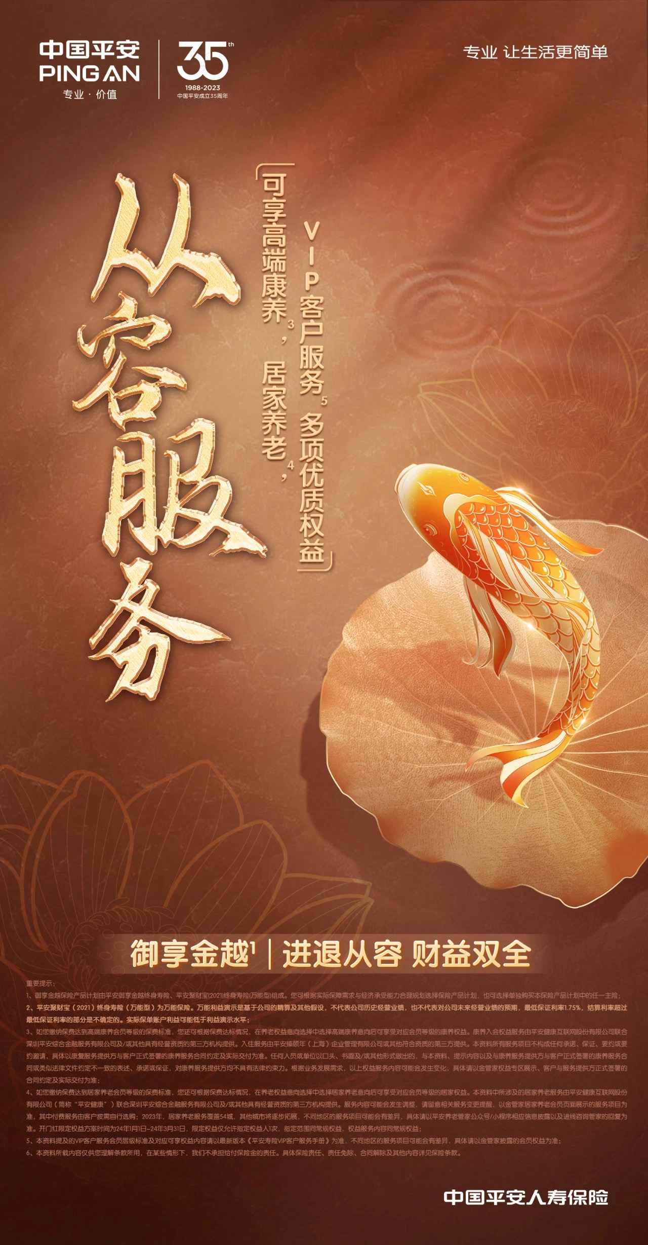 服务民生保障和经济社会发展是保险的天然使命,也是保险业迈向高质量发展的应有之义。平安御享金越终身寿险保险产品计划、平安御享金越终身寿险(分红型)保险产品计划,融财富储备、增长和传承于一体,帮助客户在守住确定性的同时,兼顾财富的成长,享受时间的馈赠。平安人寿表示,未来,公司将继续坚守金融为民初心,立足消费者需求,为客户提供“省心、省时、又省钱”的产品和服务,承托万家幸福平安。