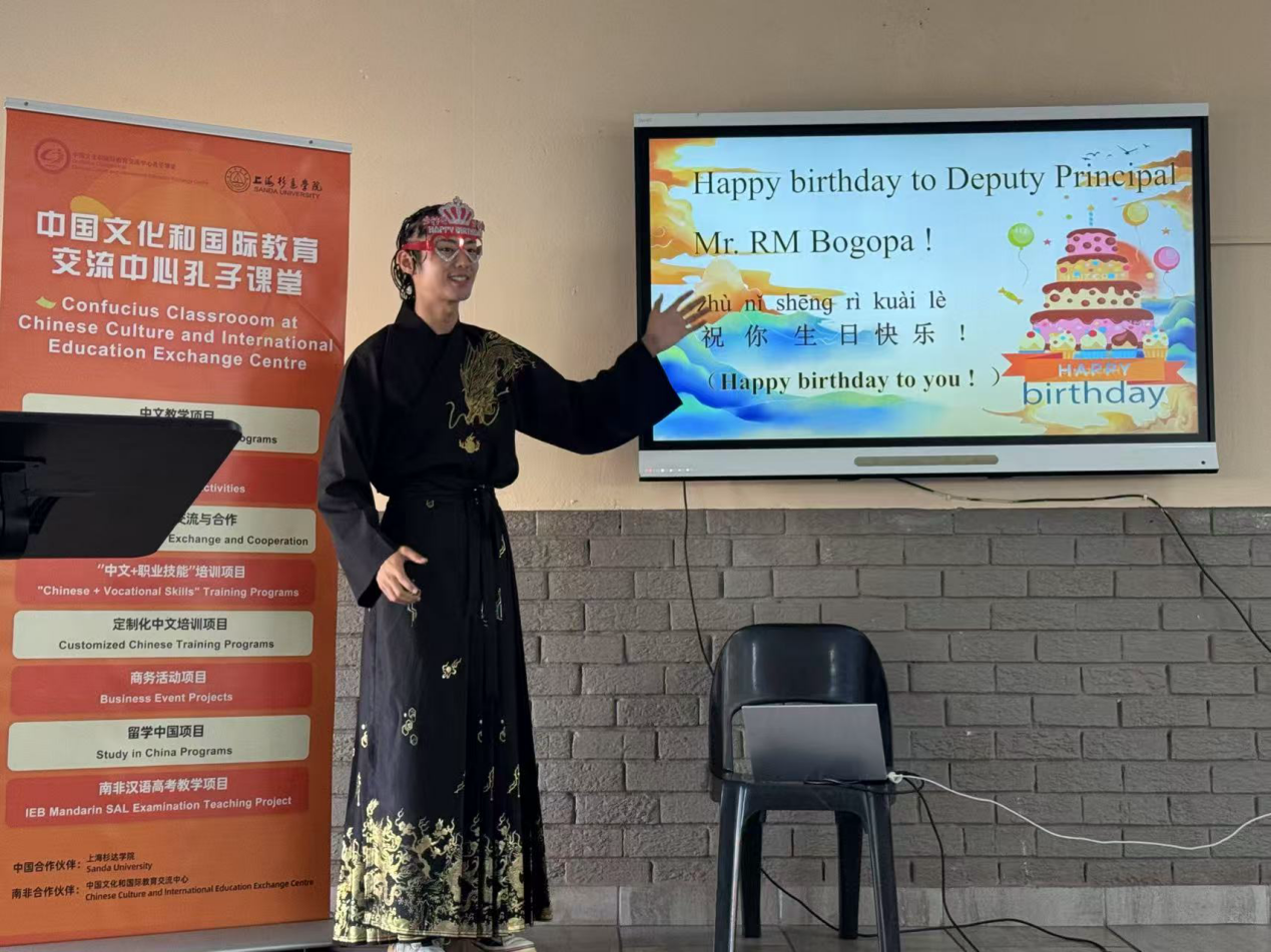 志愿者王清超带领南非学生们齐唱中文版《生日快乐》歌。孔子课堂供图