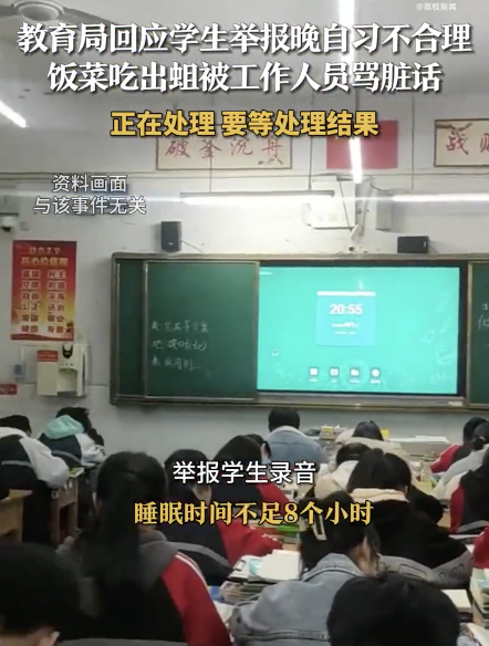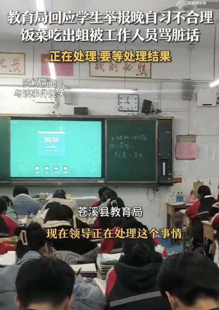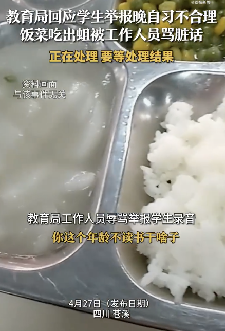 教育局回应学生举报饭菜有蛆被骂 官方正调查处理!近日,四川广元苍溪县一名学生向教育局举报学校晚自习时间安排不合理以及食堂饭菜中发现蛆虫的问题。然而,教育局工作人员回应时却说:“你这个年龄不读书干啥子,我代表你老爸老妈来骂你。”