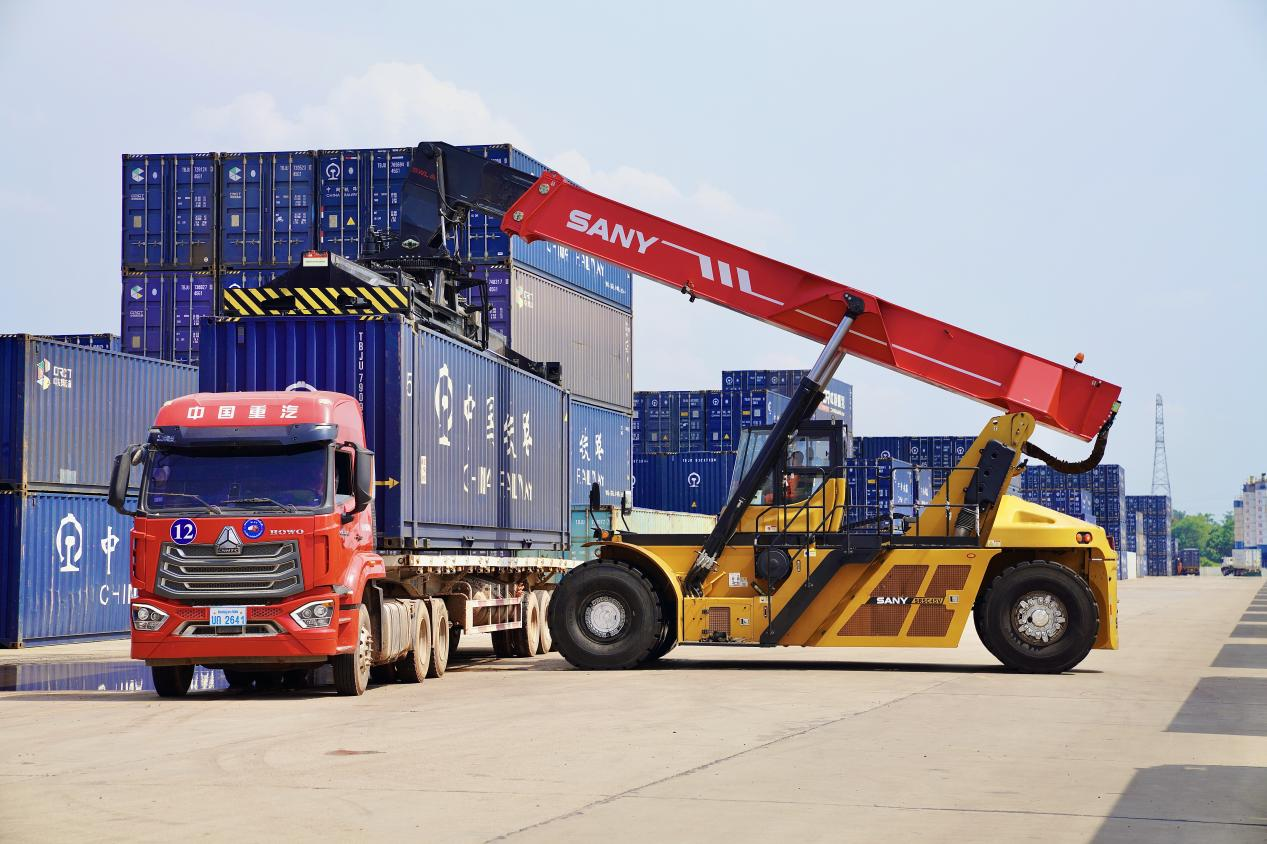 在中老铁路万象南铁路货运口岸站,起重机正在吊装集装箱。刘莹嘉摄