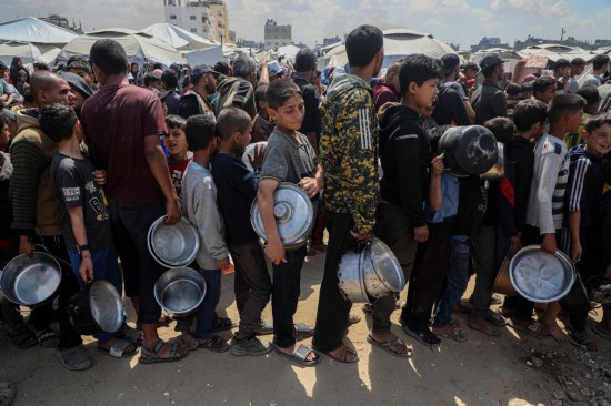 5月2日,人们在加沙城等待领取救助食物。新华社发(里泽克·阿卜杜勒贾瓦德摄)