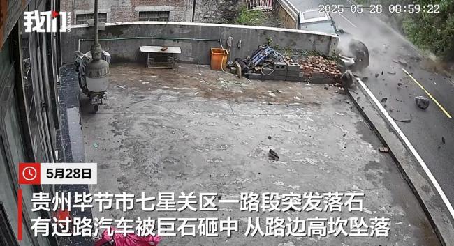 300斤巨石砸中汽车 司机幸运逃生 地质灾害点雨后落石!5月28日,贵州毕节市七星关区何官屯镇一条通村公路上发生落石事故。一块约300斤重的巨石砸中一辆过路汽车,导致车辆从路边高坎坠落。司机受轻伤,送医检查后当日返回家中,车损由保险公司处理。