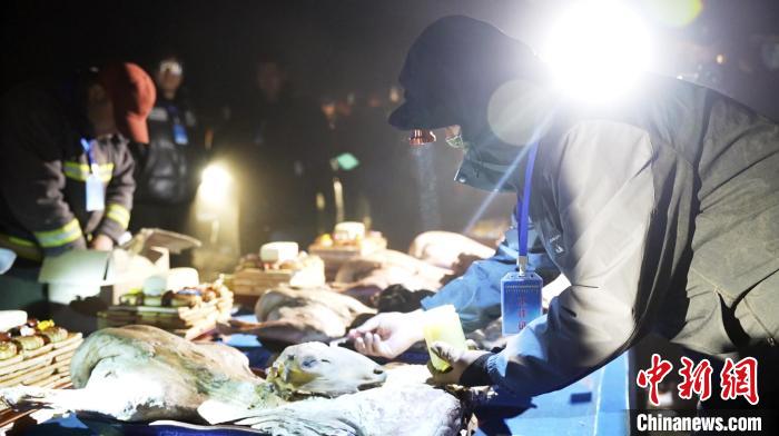 6月8日,工作人员正在做祭敖包之前的准备工作,为羊头点黄油。崔博群 摄