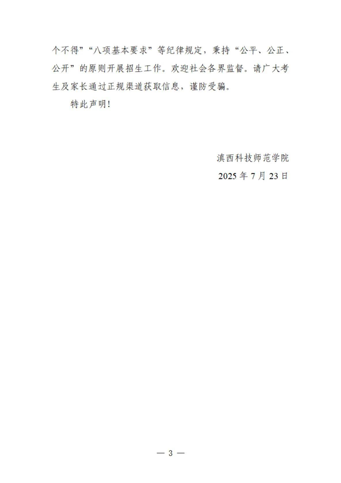 目前,云南省2025年普通高校招生录取工作正在进行中。7月23日,云南农业大学、滇西科技师范学院发表声明称,学校近期发现部分人员在网络平台传播非官方招生答疑信息,此类行为可能误导考生及家长,存在信息泄露和诈骗风险。