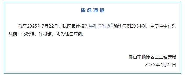 广东省佛山市顺德区卫生健康局23日通报,截至2025年7月22日,该区累计报告基孔肯雅热确诊病例2934例,主要集中在乐从镇、北滘镇、陈村镇,均为轻症病例。