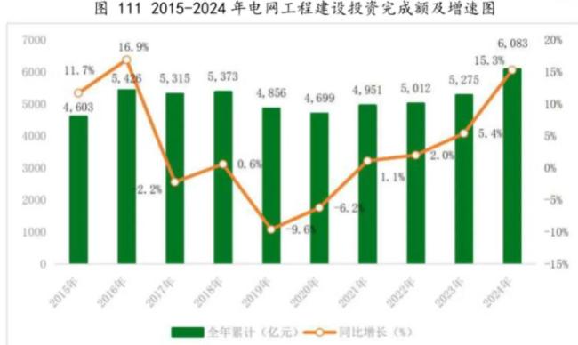 进入“十四五”后,国内电网建设迎来新一轮投资高峰,投资完成额在2021年恢复增长,并在2024年突破6000亿元大关,同比增长15.3%,创下历史新高。