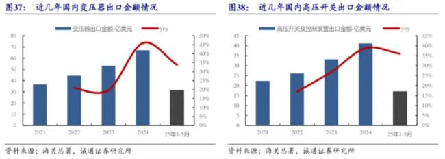 而要满足庞大的电气设备需求,大概率还得靠中国的制造业。近年来国内变压器、高压开关等产品出口金额逐年攀升,2025年1-5月仍分别有34%、36%的同比增速。