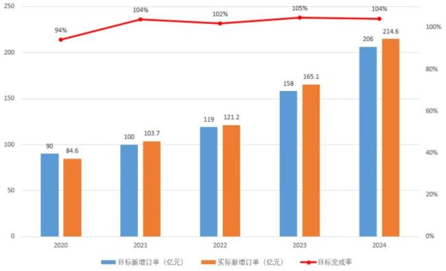 2024年年报中提到,全年新增订单214.57亿,同比增长29.9%,较当年营收高出了4成。对于2025年,新增订单目标值为268亿,对应同比增长25%。