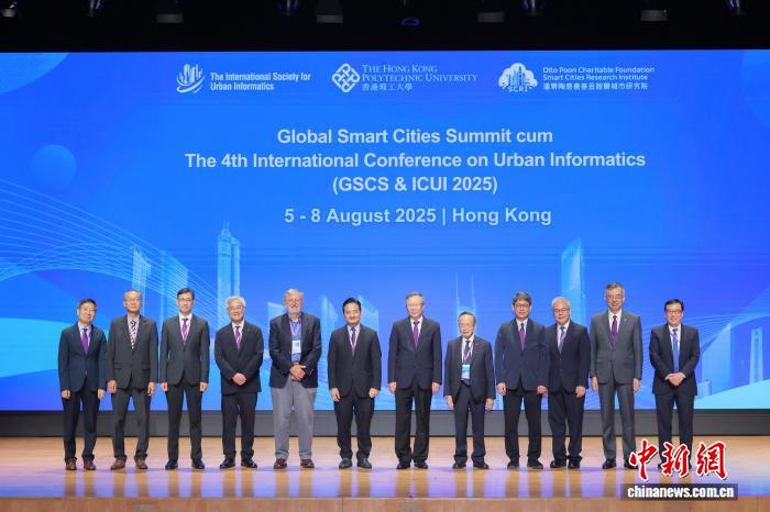 8月6日,香港理工大学潘乐陶慈善基金智慧城市研究院及国际城市信息学会在香港联合举办“全球智慧城市峰会暨第四届国际城市信息学大会”。图为一众嘉宾在开幕礼合影。(香港理工大学供图)