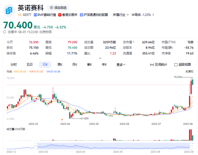 8月4日,英诺赛科上涨30.47%,报收75.15元。纵观近两个交易日,该股累计涨幅高达70.8%,总市值一举跃升至672亿港元。