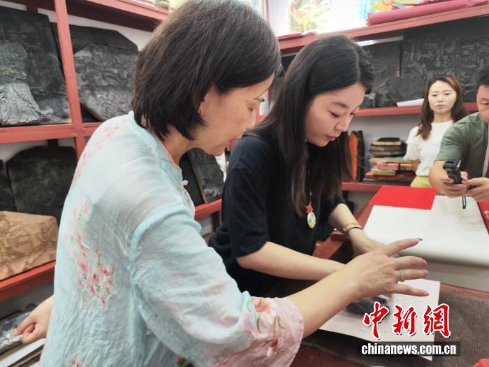 “玉成号画庄”第七代传承人张宏(左)在指点媒体采访团成员“印”年画的要领。中新网 刘越 摄