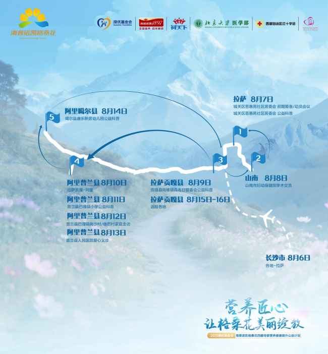 8月6日到16日,2025澳优基金会海普诺凯格桑花公益行将跨越拉萨、贡嘎、阿里、普兰、山南等地,开展健康科普、村医培训、学术交流、爱心义诊、家庭走访等多元化公益活动。项目计划在贡嘎县开展母婴家庭科普,为西藏自治区父母传递科学哺育知识;在西藏自治区母子保健协会和山南市妇幼保健院进行医学学术交流,提升本地医疗服务水平;走进普兰县小学、普兰县人民医院、噶尔县幼儿园,为当地母婴送去定制营养支持与专业呵护。在为期11天的行程里,公益团将用实际行动践行守护“生命早期1000天”的承诺。