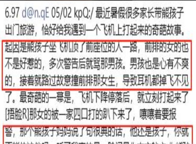 南航打人“熊家长”社死!父亲身份被扒 惯子如杀子!最近,一起发生在飞机上的事件引起了广泛关注。一名女乘客在航班上遭遇了来自一个小男孩及其家人的围殴。小男孩的父亲竟然以“他还只是个孩子”为借口,拒绝承担责任。