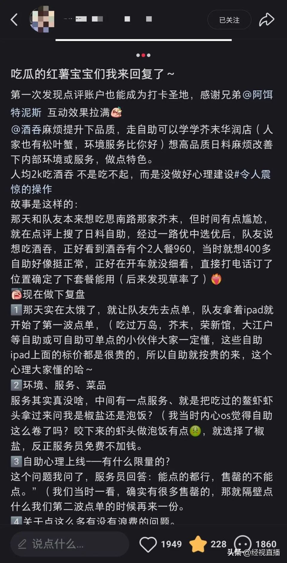 8月13日,经视直播记者联系上这家名为酒吞世纪汇店的日式料理店。工作人员回应称,他们已注意到相关内容。并表示门店在所有平台上都从未标注过自己是自助,消费者在就餐时工作人员也会提醒菜品的价格。工作人员还表示,他们店人均消费额在300至500元之间,对于该网友的具体情况,工作人员说明,当时他们也注意该网友点餐量较大,但工作人员有提前告知每道菜品的价格,“她点菜的时候,我们有跟她说过每道菜多少钱,她可能没有在意”。