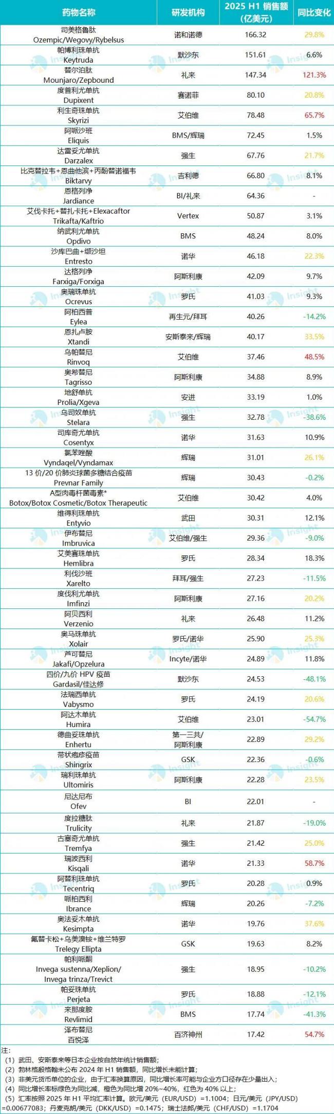 从公布的2025上半年全球药品销售额TOP50来看:“药王”之争渐趋白热化;明星药“花期”越来越短;百年药企“王牌”产品储备告急;中国创新药“逆袭”……