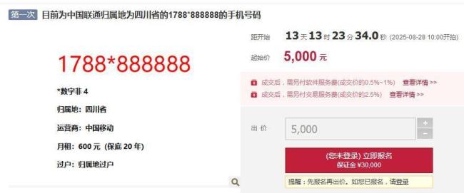 8个8手机靓号将以5000元起拍!8月14日,阿里资产·司法平台发布信息,甫拍(重庆)科技有限责任公司计划于2025年8月28日10时至29日10时在阿里巴巴司法拍卖网络平台上首次公开拍卖一个归属地为四川省的中国联通手机号码1788*888888。该号码起拍价为5000元,保证金为30000元,增价幅度为1000元。此号码目前套餐为600元,过户后消费协议年限为20年,且中间隐藏的数字并非4。号码绑定的银行卡、微信、支付宝等具体情况不详,实际情况以运营商规定为准。