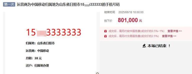 甫拍(重庆)科技有限责任公司在阿里巴巴司法拍卖网络平台上已有多次成功拍卖记录,其中包括多个手机“靓号”。例如,在2025年8月14日上午结束的一场拍卖中,该公司拍卖的一个归属地为北京市的171111111的手机号码,经过110次竞价,最终以15.3万元的价格成交。而在2025年7月9日上午结束的另一场拍卖中,一个中国电信归属地为天津市的133*99999的手机号码,经过43次竞价,以30.6万元的价格成交。此外,7月8日,该公司还拍卖了一个中国电信归属地为天津市的13*655555的手机号码,经过72次竞价,以37.1万元的价格成交。2025年6月18日上午,一个归属地为山东省日照市的中国移动手机号码153333333,经过81次竞价,以80.1万元的价格成交。