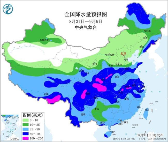 未来10天(8月31日-9月9日),西北地区东南部、黄淮、江汉、江淮、江南北部、四川、云南西部、西藏东南部、华南沿海等地累计降水量有50~80毫米。其中陕西南部、山西南部、四川盆地、江淮等地的部分地区累计降水量有100~130毫米,局部地区超过150毫米;上述大部地区降雨量较常年同期偏多5~8成,局部偏多1倍以上。