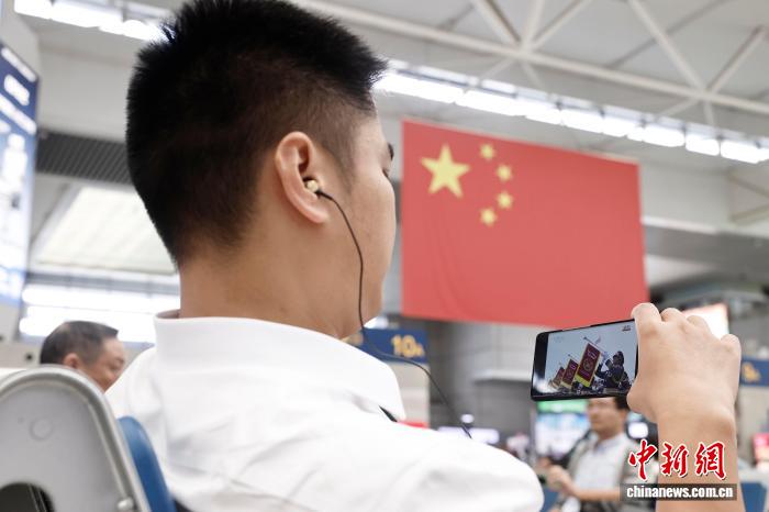 图为在铁路上海虹桥站候车大厅,旅客用手机拍摄视频直播画面。中新社记者 殷立勤 摄