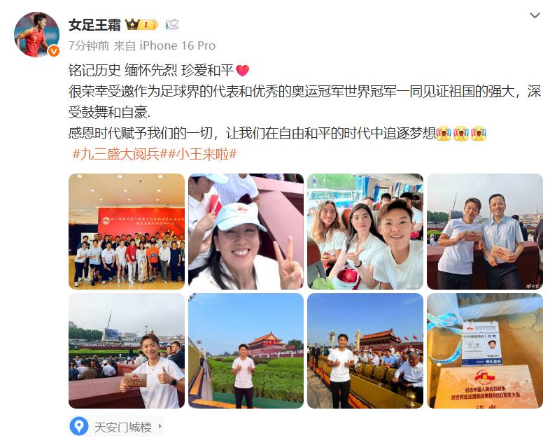 女足国脚王霜受邀出席大会并观看阅兵仪式,与郑钦文、张雨霏合影,并发布多张图片记录。