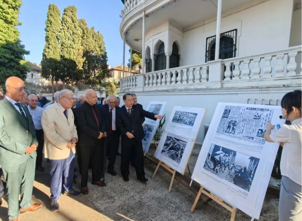 与会来宾一同观看了中国人民抗日战争暨世界反法西斯战争胜利80周年纪念大会视频和《东方主战场》专题片,参观了“弘扬伟大抗战精神”主题图片展。现场还首映了60年前曾在华培训的阿尔及利亚老战士访华纪录片,影片中,老战士们重返故地,深情回忆在中国接受培训的点点滴滴。