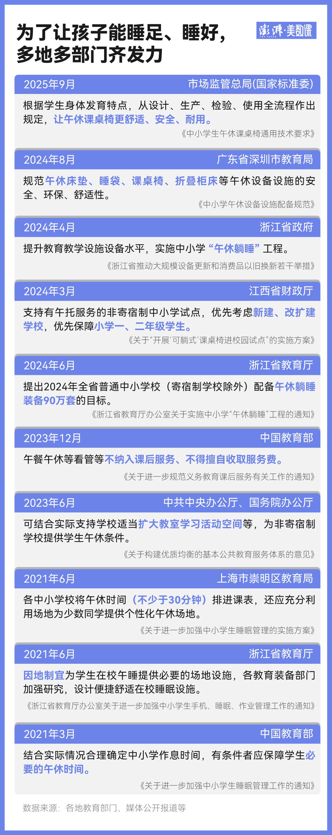 比如,2023年国务院专门出台政策,支持学校扩大教室学习活动空间和体育运动场地,为午休提供条件;九江市则表示 “可躺式” 课桌椅试点所需资金,由省、市、县(市、区)财政按一定比例分担,学校和家长无需承担任何费用;浙江省政府更是直接把“午休躺睡”写入了《浙江省推动大规模设备更新和消费品以旧换新若干举措》。