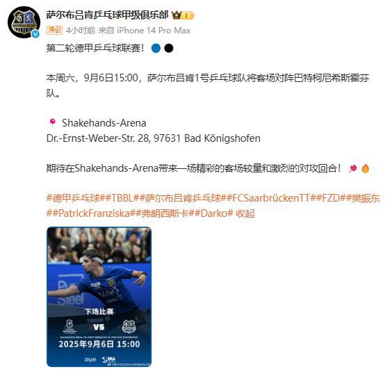 9月4日,萨尔布吕肯乒乓球甲级俱乐部预告了樊振东的德甲客场首秀。比赛将在9月6日15:00举行,萨尔布吕肯1号乒乓球队将客场对阵巴特柯尼希斯霍芬队,期待在Shakehands-Arena带来一场精彩的较量。
