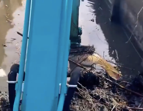 男子开挖机清理河道,结果夹上来一条大鱼,男子:今晚可以加餐了。