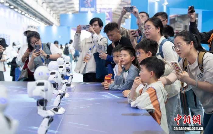 浙江杭州一AI机器人乐园内,参观者观看机器人舞蹈表演。吴君毅 摄