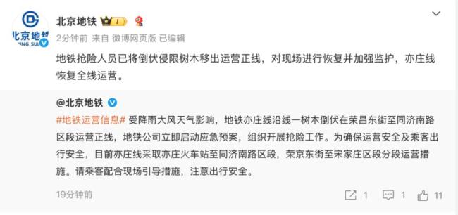 19时56分,地铁抢险人员已将倒伏侵限树木移出运营正线,对现场进行恢复并加强监护,亦庄线恢复全线运营。