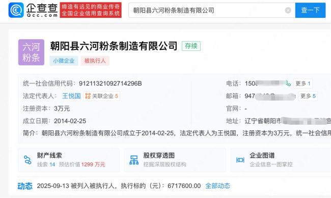 企查查APP显示,朝阳县六河粉条制造有限公司近日新增了一则被执行信息,执行标的为671.76万余元,执行法院为辽宁省朝阳市朝阳县人民法院。该公司成立于2014年2月,法定代表人为王悦国,注册资本3万元。