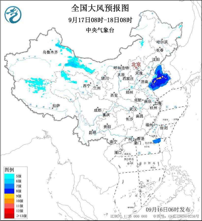 9月17日8时至18日8时,新疆东部、甘肃河西、青海北部、西藏北部等地部分地区有5级、阵风6级的大风,其中,甘肃河西等地局地风力可达7级、阵风8级;黄海大部海域将有7~8级、阵风9级的大风,其中黄海中部的部分海域风力可达9级、阵风10级。