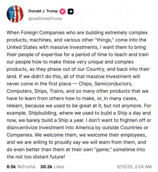 特朗普14日在社交媒体上发文说,在芯片、半导体、计算机等很多产品的生产中,美方人员要向外国员工学习,并表示希望外国企业的专业技术人员能够教授和培训美方人员制造技术。