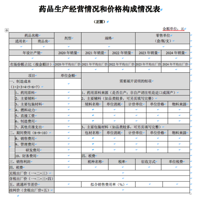 表格注释要求:按挂网实际规格填报,同品种多个规格挂网的,每个规格独立填报;同时存在出厂价低开和高开两种情形的,每个出厂价独立申报;此外,还给出了复杂的拟合销售费用率的计算公式。