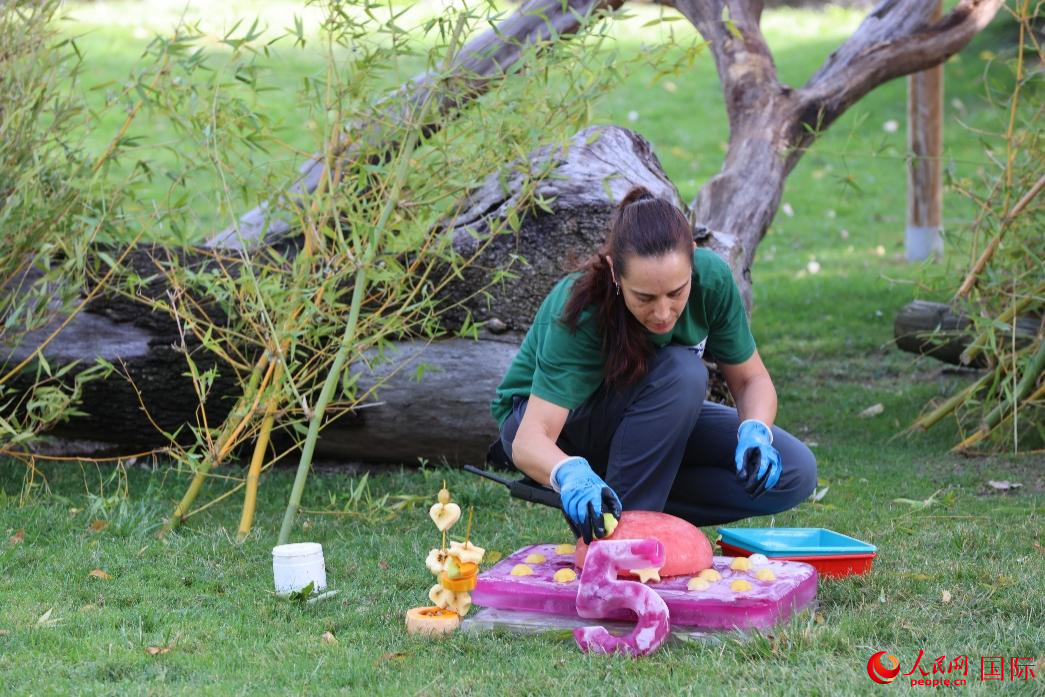 图为饲养员为大熊猫准备特制的生日蛋糕。人民网记者 许海林摄