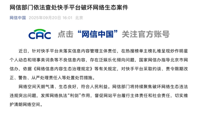 (原标题:网信部门依法查处快手平台破坏网络生态案件)