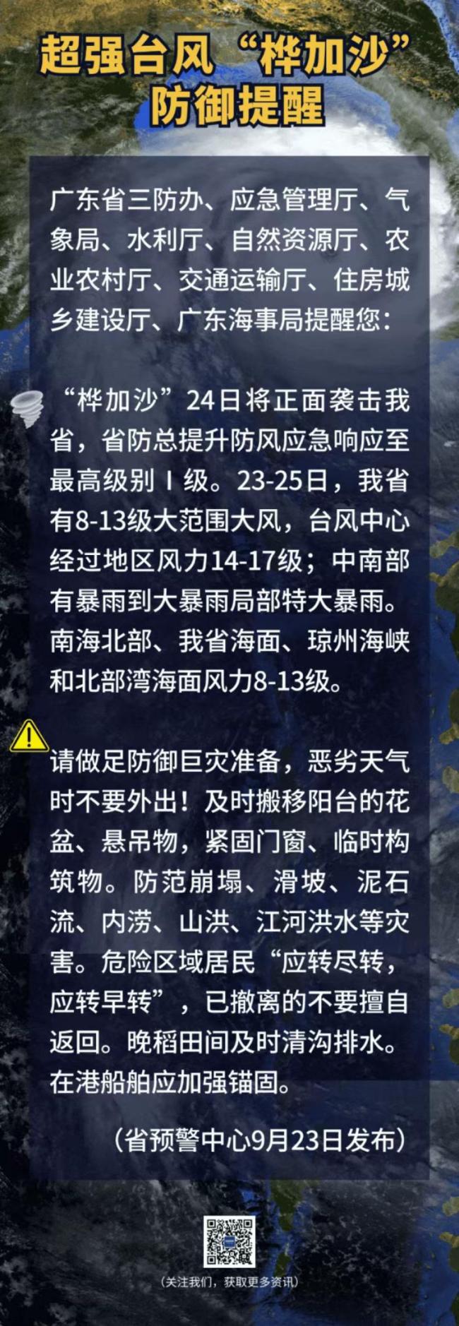 据海南省气象台9月23日上午消息,“桦加沙”(超强台风级)已进入南海东北部海面,预计24日在广东深圳到徐闻一带沿海登陆(强台风级或超强台风级,14-16级,45-52米/秒)。广东省防汛防旱防风总指挥部于23日10时将防风Ⅱ级应急响应提升为防风Ⅰ级应急响应,要求重点地区果断采取“五停”措施(即停课、停工、停产、停运、停业)。东莞、中山、惠州、江门、珠海、深圳等地纷纷发布通知,分批实行“五停”措施。