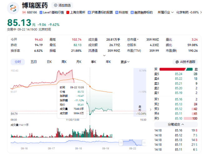 9月22日午后,博瑞医药(688166)股价跳水回落,盘中一度跌逾10%。