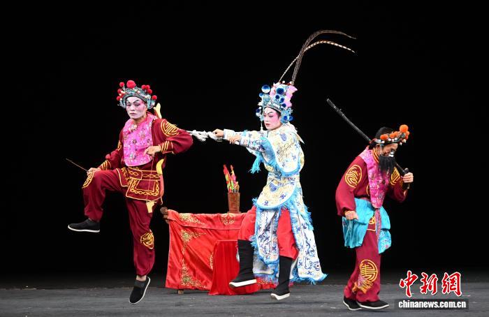 9月23日,福建福州,福建南平市南词艺术传承发展中心的演员正在表演南词戏《百花赠剑》选段。福建传统折子戏展演正在福州举行,当天,南词戏、三角戏、四平戏、梅林戏等福建稀有剧种集中上演。中新社记者 吕明 摄