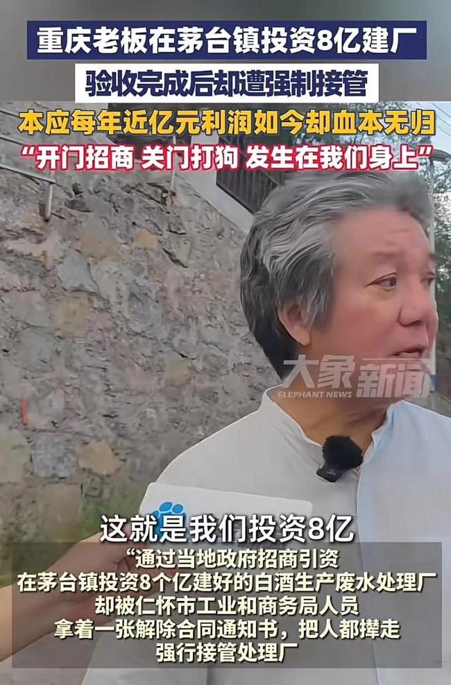 8亿污水厂被接管是关门打狗还是违约 营商环境信誉受损!重庆老板唐显策响应茅台镇招商号召,投入8亿建成白酒废水处理厂。工厂刚有收益就被当地部门强制接管。尽管法院判定“解除合同通知书”无效,但三年过去,工厂仍未归还,唐显策血本无归。此事引发网友热议,有人痛斥“关门打狗”,也有人呼吁看完整细节。从法律和营商环境角度看,这一事件暴露的“违约侵权”问题对地方招商信誉打击极大。