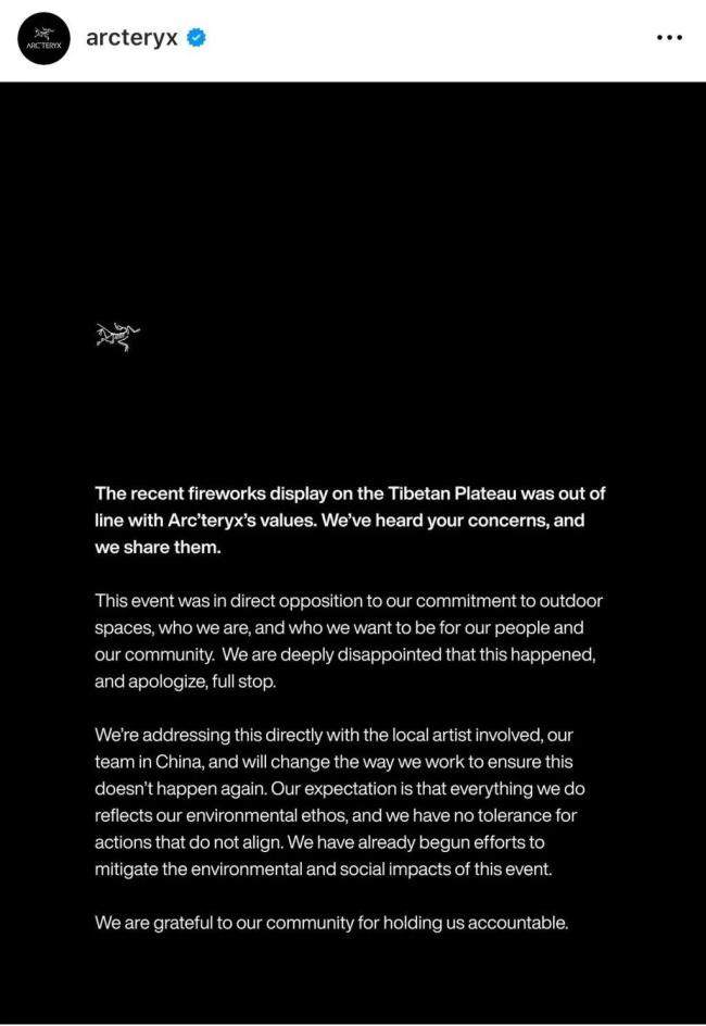 9月21日,始祖鸟在国内社交平台发布的致歉信中提到,近期品牌赞助的蔡国强《升龙》艺术项目引发了广泛的公众讨论,该项目本是希望通过艺术家的创作,提升对高山在地文化的关注。尽管怀揣这样的初心,在作品呈现过程中仍出现偏差甚至偏离。大家的肺腑之言让他们警醒:对艺术表达边界的评估需要更加专业,对自然的敬畏需要更加谦卑。