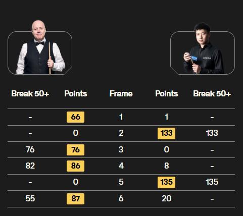 背水一战的赵心童在第五局顶住压力,打出单杆135分挽救一个赛点,将比分追至2比3。第六局,赵心童率先上手,但在拿到20分后因位置不理想被迫转为防守。希金斯做出高质量斯诺克,赵心童解球失误并给希金斯留下进攻机会,最终希金斯单杆55分赢得第六局,以4比2战胜赵心童,赵心童遭遇面对希金斯的四连败。