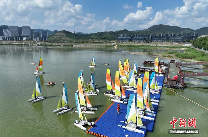 9月27日,航拍比赛现场。当日,2025中国家庭帆船赛·杭州站在浙江杭州临安青山湖拉开帷幕,来自北京、上海、武汉等10个城市的40组家庭近百名选手在绿水青山间扬帆。(无人机照片)中新社记者 王刚 摄