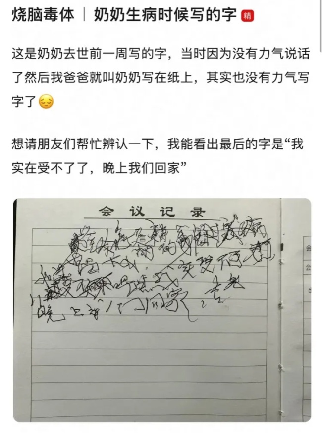 “奶奶去世前写的请大家帮忙辨认”。