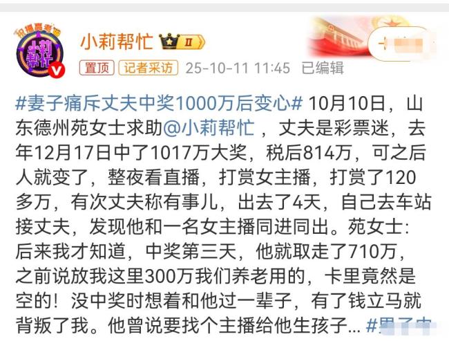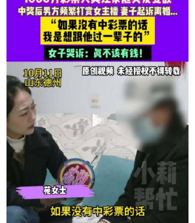 中奖1000万男子回应打赏主播 变心丈夫遭妻起诉。有人中了彩票后会选择与原配离婚。近日,一名女子称自己的丈夫在中了1000万后频繁打赏女主播,已经变心。妻子决定起诉离婚,并表示如果没有中彩票,她原本打算和丈夫过一辈子。
