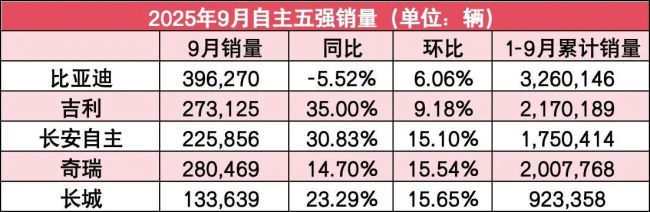 首先,比亚迪销量为396270辆,同比下滑5.52%,环比增长6.06%。去年同期,比亚迪月销量近42万辆,这也是比亚迪自2024年3月以来首次出现单月销量同比下滑。实际上,从生产端来看,比亚迪销量从7月份就已经出现了同比下滑,已经连续3个月同比下滑。不过从规模来看,比亚迪依然是遥遥领先,今年1-9月比亚迪累计销量3,260,146辆,同比增长18.64%。
