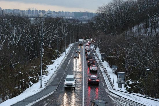 这是2024年11月21日拍摄的白雪映衬下的乌克兰首都基辅右岸沿河公路。新华社记者李东旭摄