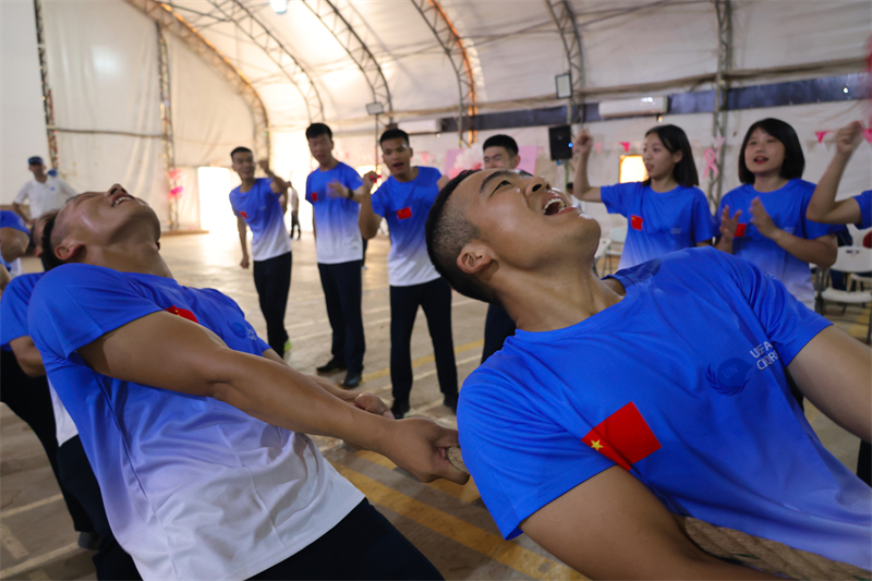 “1,2,嘿!1,2,嘿……”在拔河比赛现场,来自8个国家的拔河队员展开激烈角逐。随着裁判的一声哨响,现场立刻沸腾起来,中国维和快反分队参赛队员都铆足劲往一处使,将力量拧成一股绳,充分展现团结协作、奋勇拼搏、勇争第一的精神风貌。对阵双方你争我夺,互不相让。在几轮的激烈比拼中,中国维和快反分队以全胜战绩力压群雄,最终夺得冠军。