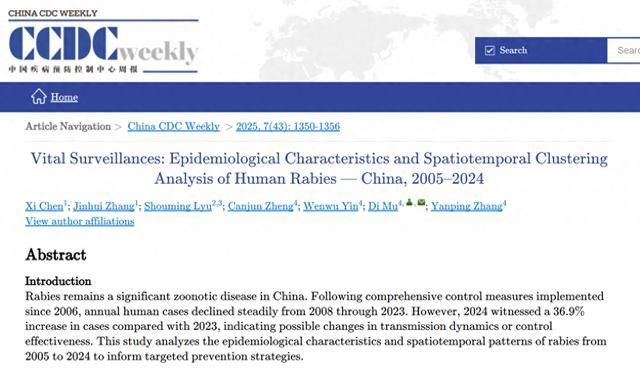 连降16年后首次上升,我国狂犬病病例数为何“反弹”? 局部复发引关注!10月24日,《中国疾病预防控制中心英文周报》发布了一项关于中国狂犬病病例数的流行病学和时空聚类分析报告。报告显示,自2006年实施狂犬病综合防控措施后,我国狂犬病病例数在2007年达到3300例的高峰后,进入了长达16年的下降趋势。然而,2024年病例数出现反弹,较2023年增加了36.9%,达167例,其中76%集中在河南、湖南、湖北、安徽、江苏等省份的省际边界。