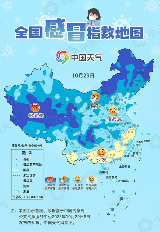 中国天气网提醒,秋冬时节冷空气活跃,气温多起伏,感冒多发。良好的生活习惯有助于预防感冒,建议大家日常生活中均衡饮食、适量运动、保证充足睡眠,避免过度劳累。同时在流感高发时期外出尽量戴好口罩,注意勤消毒,还可通过注射疫苗降低流感风险。(文/江漪 设计/王维一 数据支持/董静舒 李宁 审核/祁保刚 刘红欣 张慧 刘文静 余晓芬)